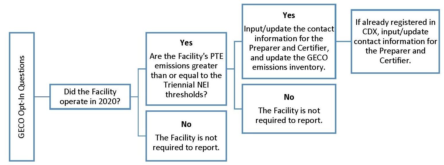 Most importantly, regardless of your facility’s current CAERS registration status, every facility must “opt-in” to CAERS through the Georgia Environmental Connections Online (GECO) portal. Each facility’s personnel responsible for completing emissions inventory requirements must navigate to the “Emissions Inventory” section of their GECO homepage and complete a short questionnaire. The following flowchart details the questions included in the GECO questionnaire: