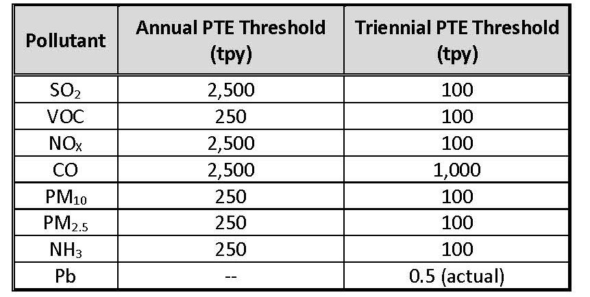 The questionnaire is designed to determine your facility’s reporting status for CY2020 and update facility contact information as appropriate. As a reminder, CY2020 is a triennial reporting year for the National Emissions Inventory (NEI), which has different potential to emit (PTE) thresholds for regulated pollutants [see comparison of thresholds in tons per year (tpy) below]. Because of the lower thresholds during a triennial reporting year, significantly more facilities will be required to report CY2020 annual emissions than a normal reporting year.