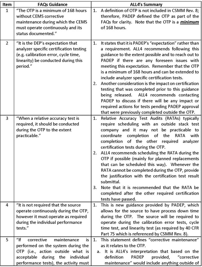 As with other CEMS certification activities under CSMM Rev. 8, presenting your approach to completing the OTP in the required Phase II – CEMS Certification Test Protocol is a must.  PADEP’s CEM Section reviews each protocol and provides feedback.  Use this to your advantage to ensure that you, your contractors, and the CEM Section are on the same page prior to completing the OTP.