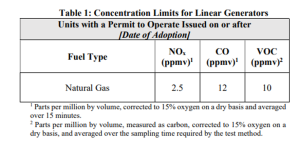 Applicability: All linear generators firing solely natural gas are subject to this rule. Requirements for linear generators firing other fuels will be determined on a case-by-case basis during the permitting process.