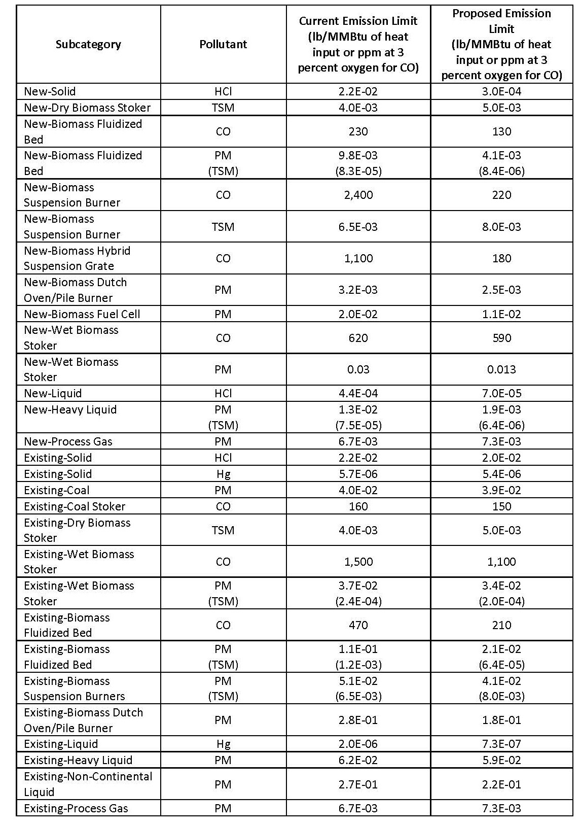Table 1 of the preamble lists the limits that U.S. EPA is proposing to change based on their re-analysis of the dataset used in the 2013 rulemaking. For existing boilers, the changes to note are small reductions in the hydrogen chloride (HCl) and mercury limits for solid-fuel units and several changes to biomass-fired unit CO and particulate matter (PM) limits. For new units, several proposed limits are significantly more stringent than current limits, such as the HCl limit for new solid-fuel units. The table below, from the preamble of the pre-publication version of the proposed rule, lists the revised limits that U.S. EPA is proposing.